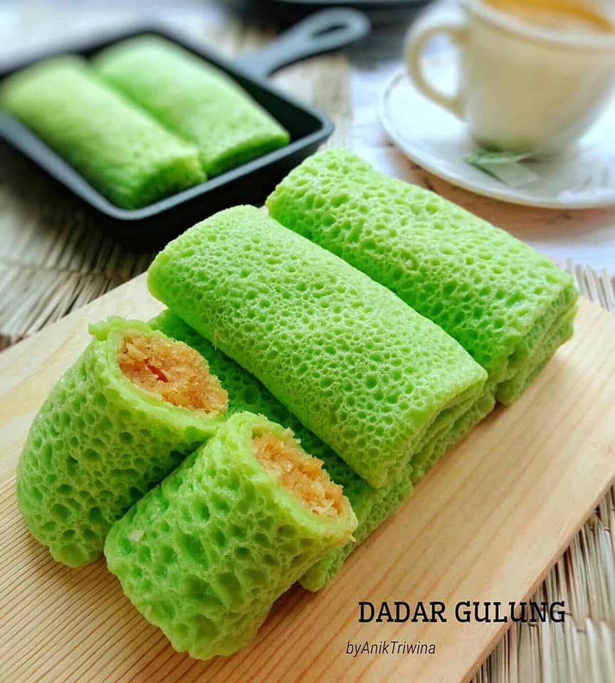Kue dadar gulung merupakan kue jajanan pasar yang memiliki rasa manis yang pas dengan isi gula kelapa dan memiliki tekstur yang sangat kenyal kue dadar. Lapisan kulit berwarna hijau menggunakan pewarna makanan atau bisa juga menggunakan daun suji, sedangkan untuk berikut cara dan resep dadar gulung berisi campuran parutan kelapa dan gula.